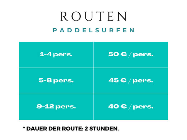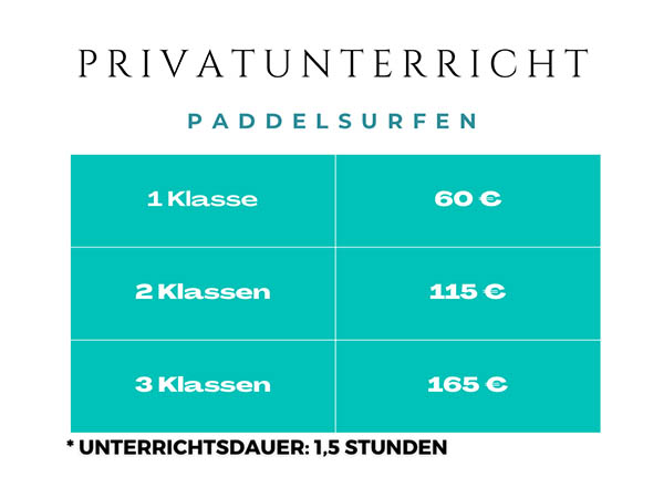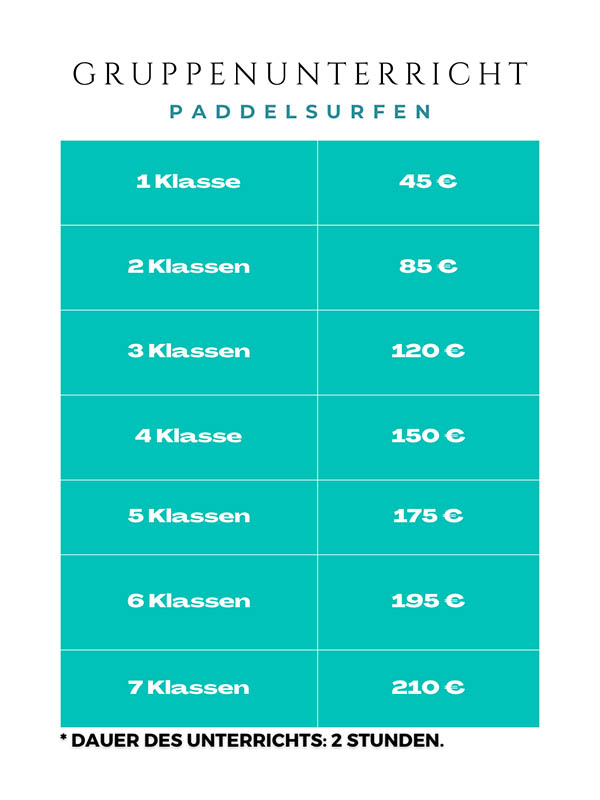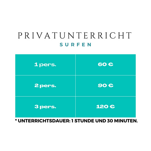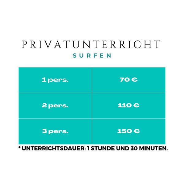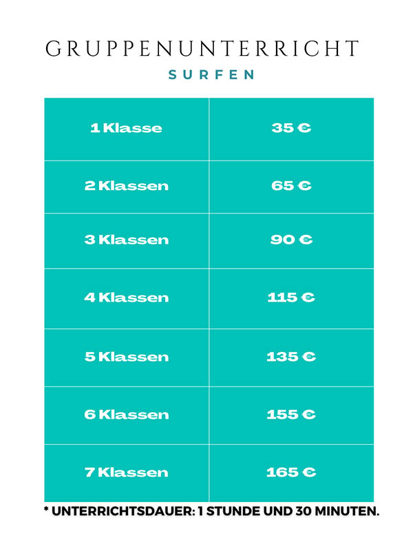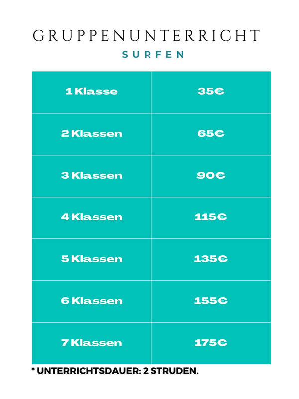 Der Preis beinhaltet das notwendige Material für die Praxis (Surfboard und Neoprenanzugund oder Lycra) und Haftpflichtversicherung.